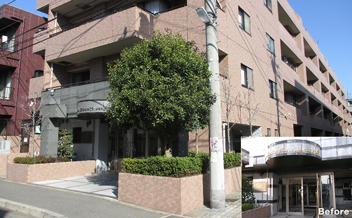 大規模修繕にあわせてエントランス回りをリニューアル。御影石の全面貼り替えとともにファサードのデザインを一新しました。