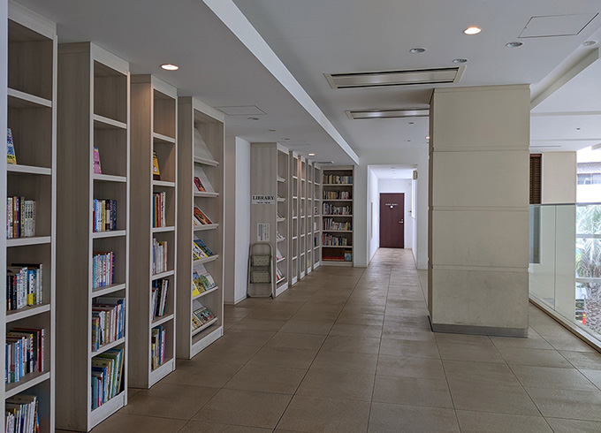 ■吹抜けに面し通路を兼ねた共用棟2階オープンライブラリ